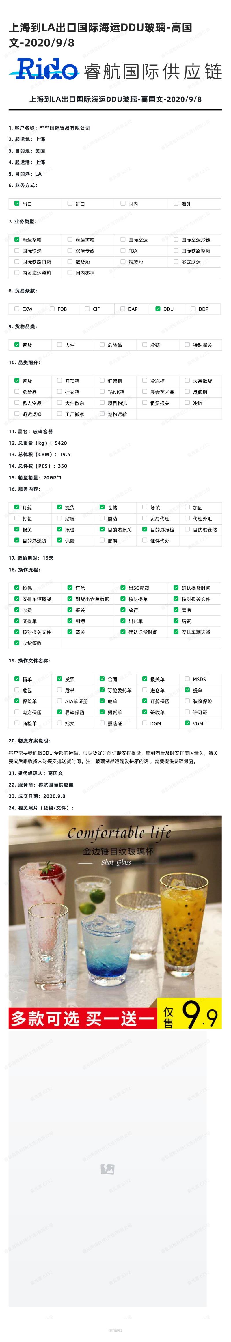 上海到LA出口国际海运DDU玻璃-高国文-2020/9/8
